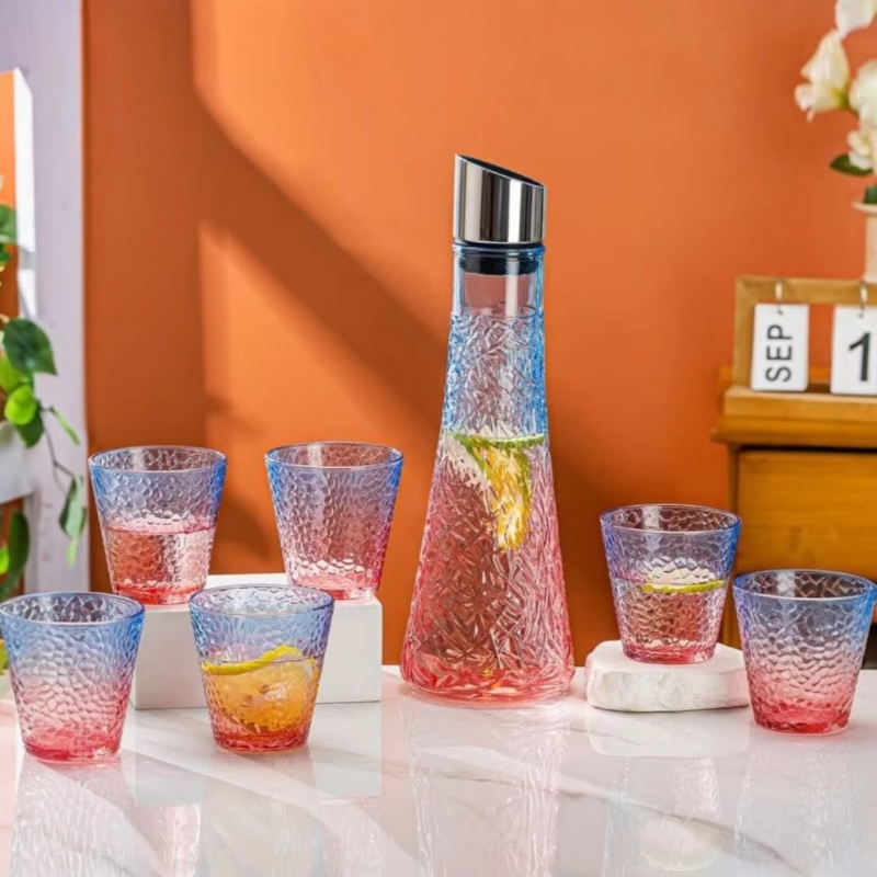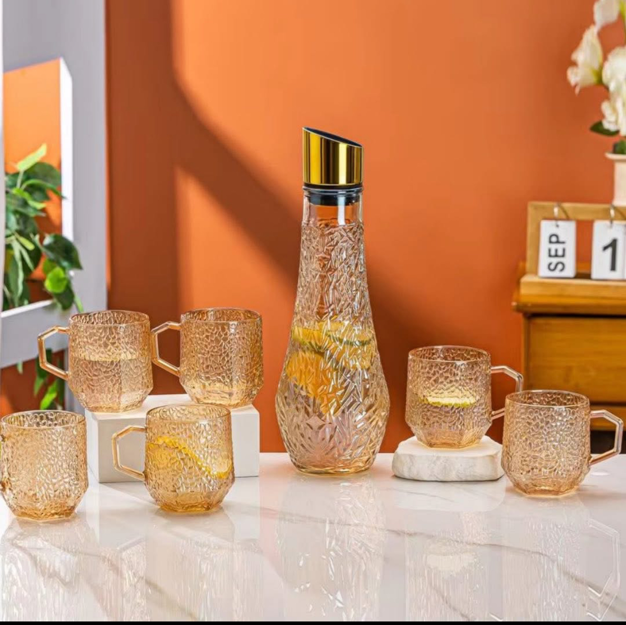 - تتكون المجموعة من 7 قطع: إبريق و 6 كؤوس.