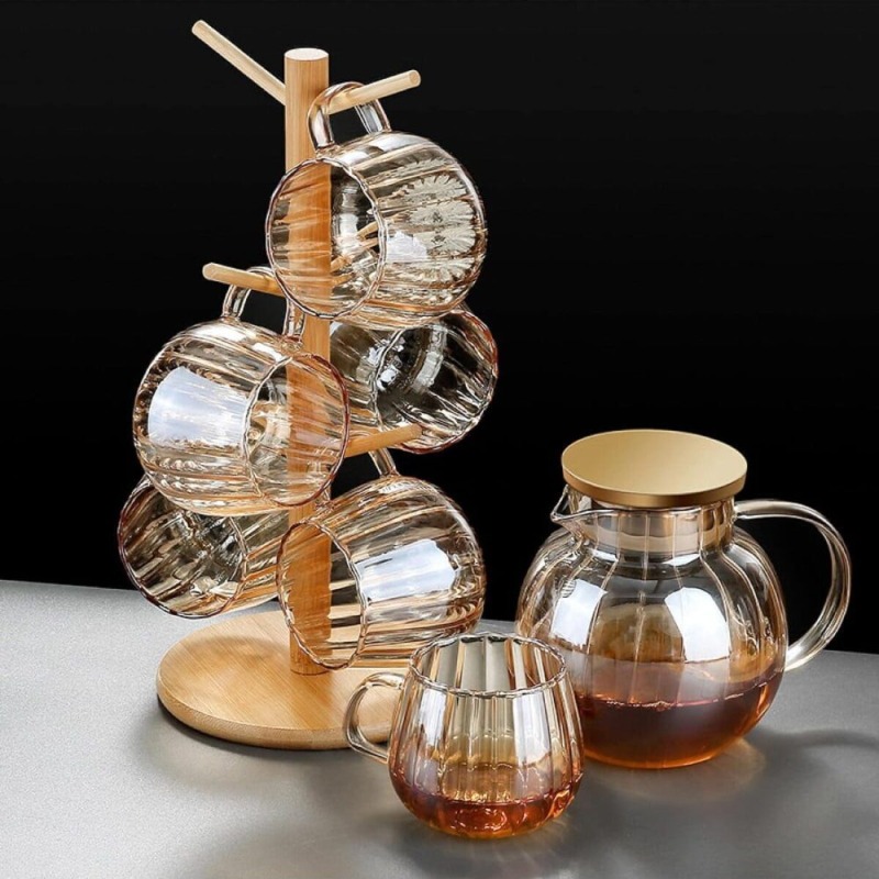 يتكون الطقم من إبريق ماء وعدد من الأكواب الزجاجية الشفافة المعلقة على حامل خشبي أنيق.