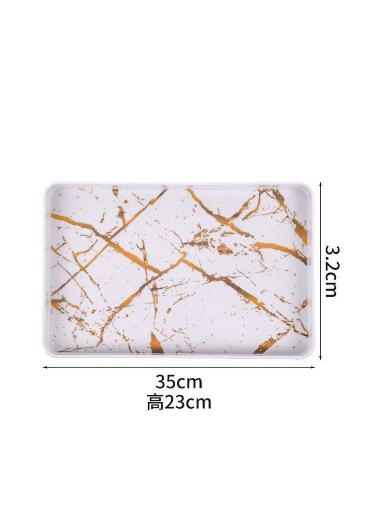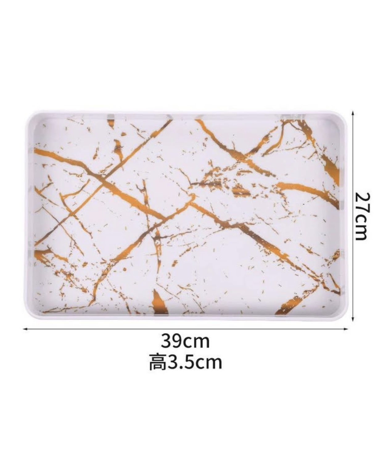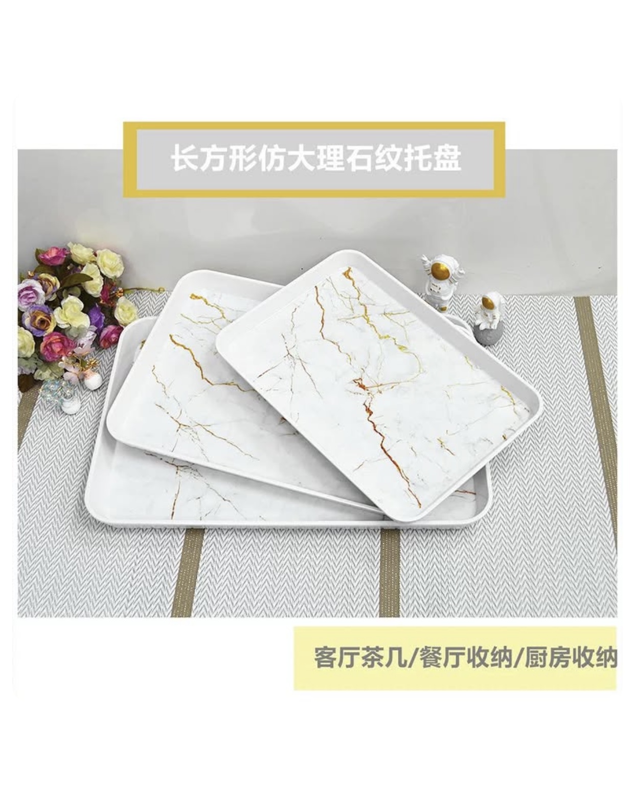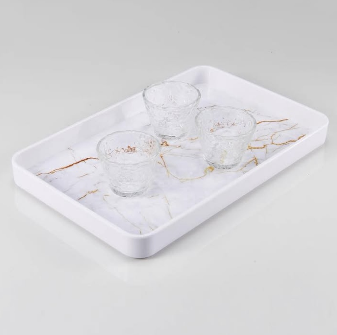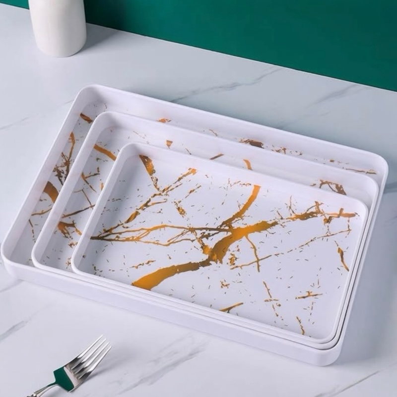 مجموعة صواني تقديم مستطيلة من الميلامين بتصميم رخامي أبيض وذهبي. 3 حبة
