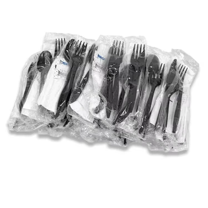 - تحتوي كل مجموعة على شوكة وملعقة وسكين بلاستيكية، مع منديل ورقي وأحيانًا ملح وفلفل.