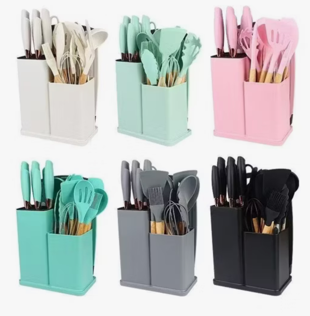 - تتضمن المجموعة أدوات طهي أساسية مصنوعة من السيليكون غير اللاصق ومقابض خشبية.