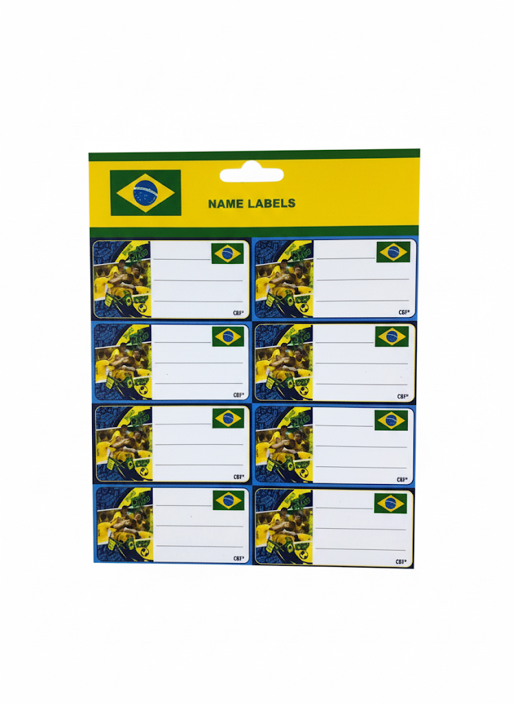 ملصقات أسماء تحمل علم البرازيل وصورًا للاعبي كرة القدم.